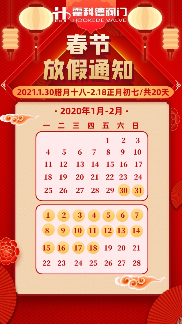 一年一度的農(nóng)歷春節(jié)已經(jīng)臨近,在此感謝你們一年來(lái)辛勤地工作和長(zhǎng)久的支持。因?yàn)橛心銈儯艨频虏拍?span style="font-size: 18px; white-space: normal;">砥礪前行和蒸蒸日上。在此,預(yù)祝全體同事新春愉快,萬(wàn)事大吉!預(yù)祝全體客戶們吉祥如意,平安喜樂(lè)!2021年春節(jié)公司安排放假時(shí)間如下: