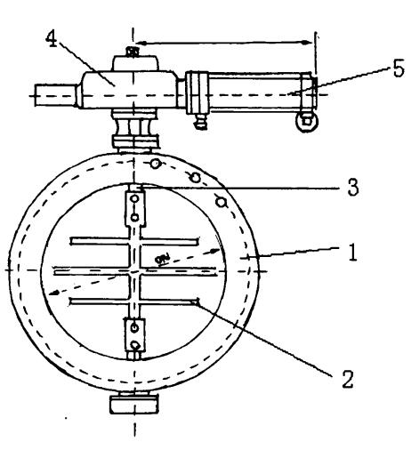 針對上述提到的塵氣碟閥的缺點,本文提供一種新型的塵氣蝶閥。為了實現上述目的,本實用新型所采取的措施氣動式斜板塵氣蝶閥,包括閥體和閥桿,所述的閥體內設有采用傾斜方式關閉的碟板,碟板與閥桿相連。所述的閥體上設有機械裝置和通過機械裝置對碟板執行啟閉的氣動裝置。本實用新型的有益效果閥門啟閉阻力減小,自動化程度大大提高,利于推廣應用。